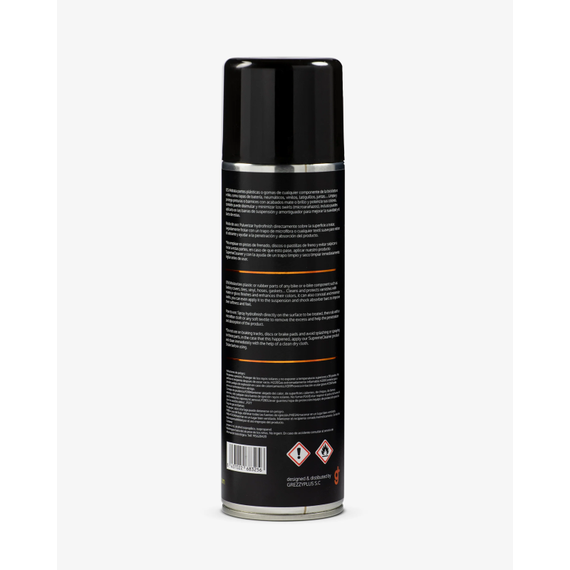 The Hydrofinish Formula 500 mL from grezzy+® is a high-quality finishing and protection spray that helps restore and protect the appearance of your bike after cleaning or a day on the trail. Its advanced formulation hydrates plastics, rubber and painted surfaces, bringing back vibrant colour and a freshly detailed finish while forming a protective layer that repels moisture and slows the return of dirt. It enhances both matte and gloss finishes without leaving greasy residues.